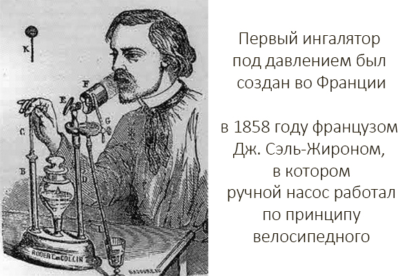 Первый ингалятор под давлением был создан во Франции в 1858 году французом Дж. Сэль-Жироном, в котором ручной насос работал по принципу велосипедного.