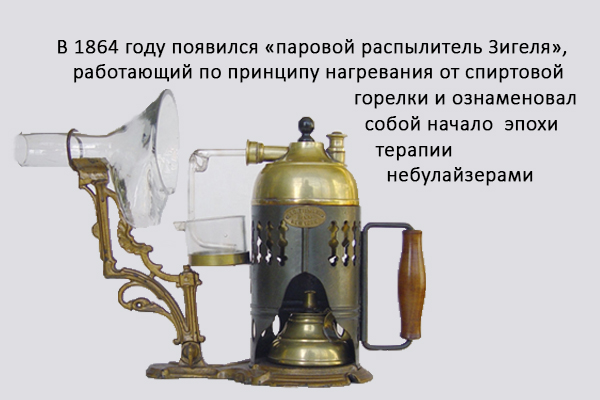 В 1864 году появился «паровой распылитель Зигеля», работающий по принципу нагревания от спиртовой горелки и ознаменовал собой начало эпохи терапии небулайзерами.
