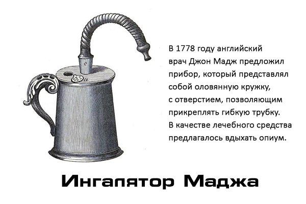 Вплоть до рубежа XVIII–XIX веков в Европе использовались различные варианты изобретения Гиппократа. Однако в 1778 году английский врач Джон Мадж предложил прибор, который представлял собой оловянную кружку, с отверстием, позволяющей прикреплять гибкую трубку. В качестве лечебного средства предлагалось вдыхать опиум. Именно от «кружки Маджа» ведется отсчет истории ингаляторов как приборов для вдыхания лечебных препаратов.